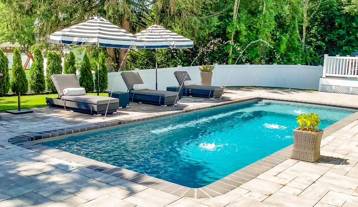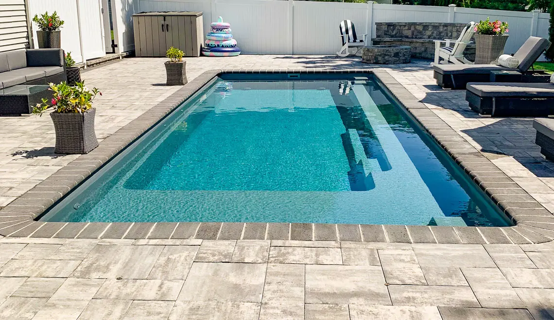 This highly popular pool model takes on many forms in terms of available options. This one comes with a 5’,1” long splash deck nestled into the shallow end, giving your family the ideal spot for relaxation and fun.
